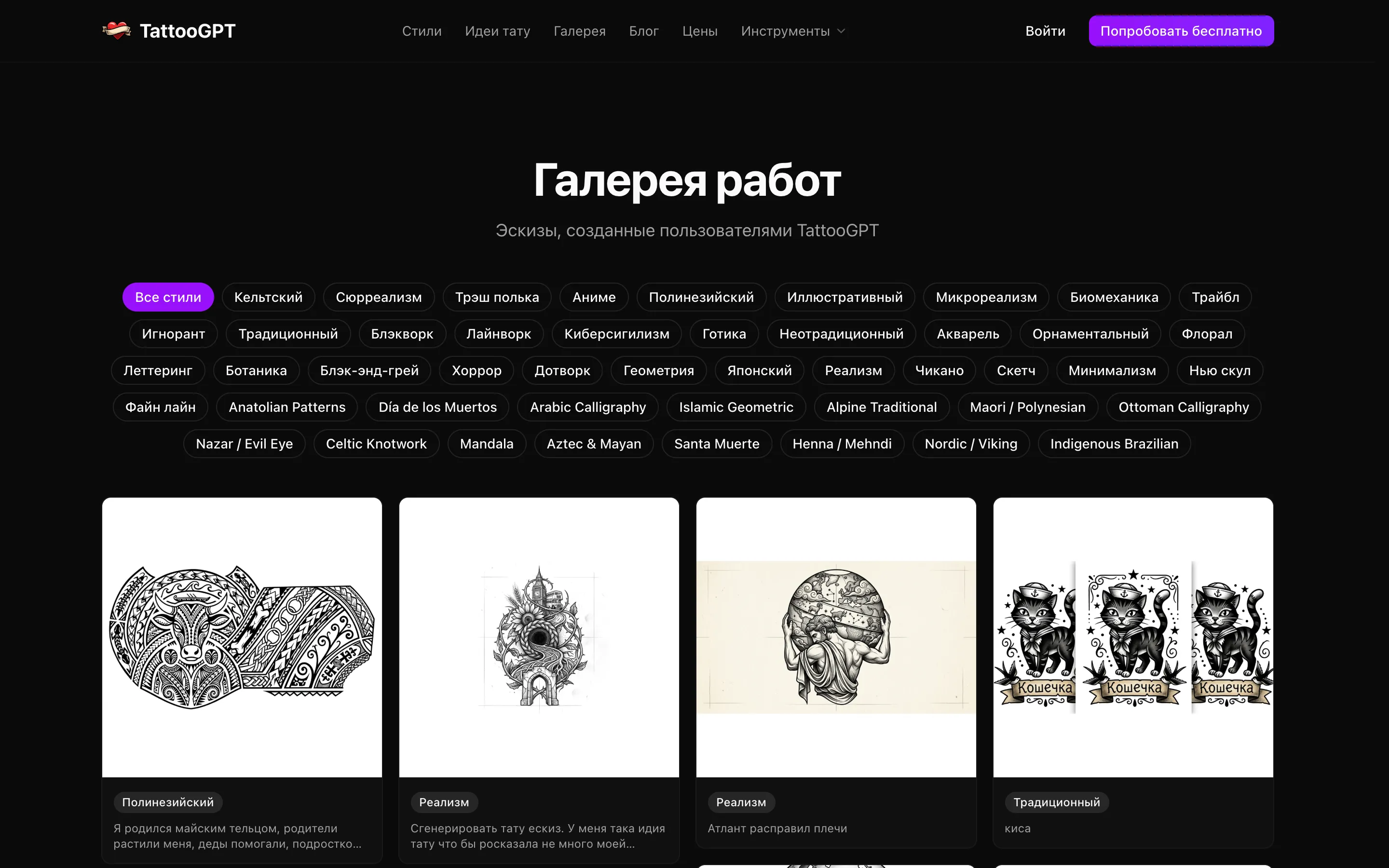 GenTattoo is an AI tattoo generator that creates professional tattoo designs from text descriptions. Our neural network is trained on millions of tattoo designs and understands the features of each of the 47 styles: from detailed realism to concise minimalism, from classic old school to modern geometry.
